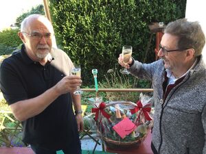 Dieter Gischer überbringt Werner Müller einen Geschenkkorb im Namen des "SPD Ortsverein Oberes Enztal" mit den allerbesten Wünschen aller Ortsvereins-Mitglieder zu seinem 70. Geburtstag.