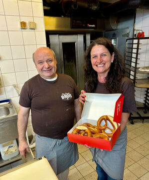 Daniela Steinrode konnte bei ihrem Besuch der Betriebsstätte nicht nur den Mitarbeiterinnen und Mitarbeitern über die Schulter schauen und einen Einblick gewinnen, sondern selbst Hand anlegen und sich im Brezelbacken versuchen. Das Sortiment reicht neben Klassikern wie schwäbischem Laugengebäck und Dinkelseelen bis hin zu neun verschiedenen Körnerbrötchen aus jeweils eigenen Teigen über zahlreiche Brotsorten bis hin zu süßen Stückchen, Kuchen und Torten. „Mir war es immer wichtig, eine große Vielfalt anzubieten“ erklärte Inhaber Broß beim Gespräch. Das sei ein wichtiges Angebot an die Kunden und werde sehr gut angenommen. Auch die Rohstoffe stammen von Herstellern aus der Region, denn Nachhaltigkeit und Regionalität sind dem Unternehmer wichtig.